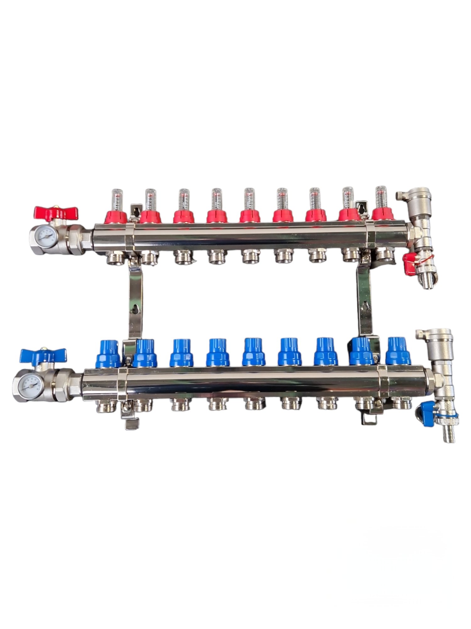 9 Heizkreise Heizkreisverteiler Premium mit Kugelhahn Absperrung Thermometer automatische Entlüftung Ablassventil Durchflussmesser